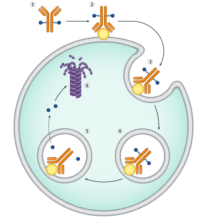이후 세포 안에서 링커카 잘리며 약물이 방출되고,