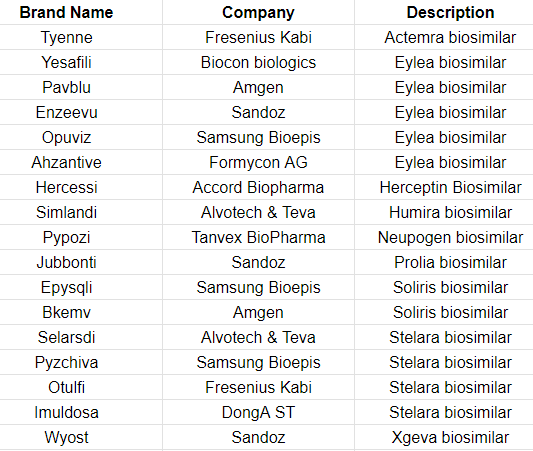 올해 바이오시밀러 승인은 Stelara와 Eylea 의 복제약들이 대부분이었습니다.
