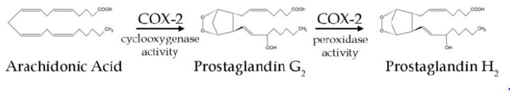 그림을 보면, 원료 물질에는 고리구조가 없는데, COX2가 작용하고 나니 오각형 고리가 하나 생기고, 산소가 추가되어 또 다른 고리가 또 생긴것을 볼 수 있다.