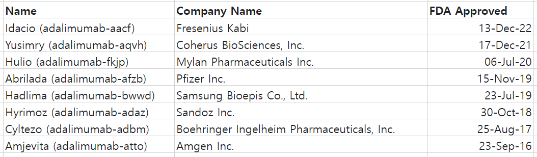 이는 2022년까지 허가가 완료된 휴미라의 바이오시밀러 리스트이다.