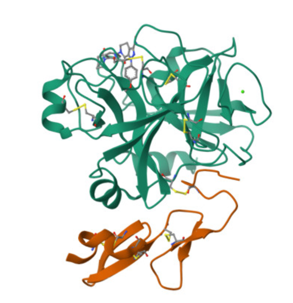 초록, 주황 체인이 FXa 이고, 위쪽에 작은 화합물이 Apixaban 입니다