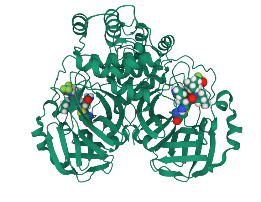 이해하기 쉬운 그림은 아니지만, 간단하게만 설명을 하면 저 위에 보이는 초록색 그림이 코로나의 단백질인 Mpro이다.