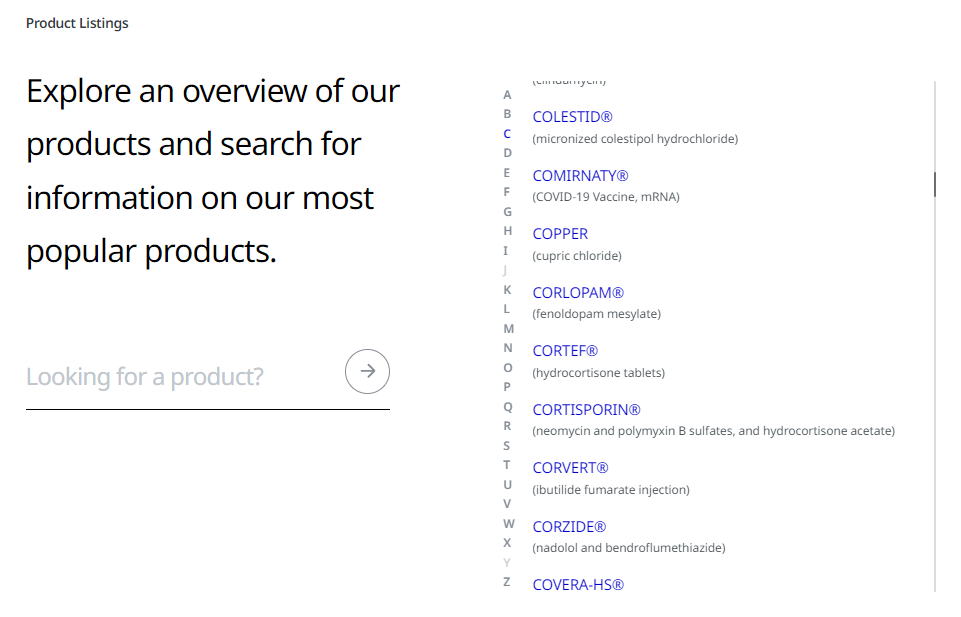 화이자 홈페이지에 가면 product list를 이렇게 볼 수 있다. A-Z 순서로 나와있는데 정말 빼곡하게 약들이 있다.