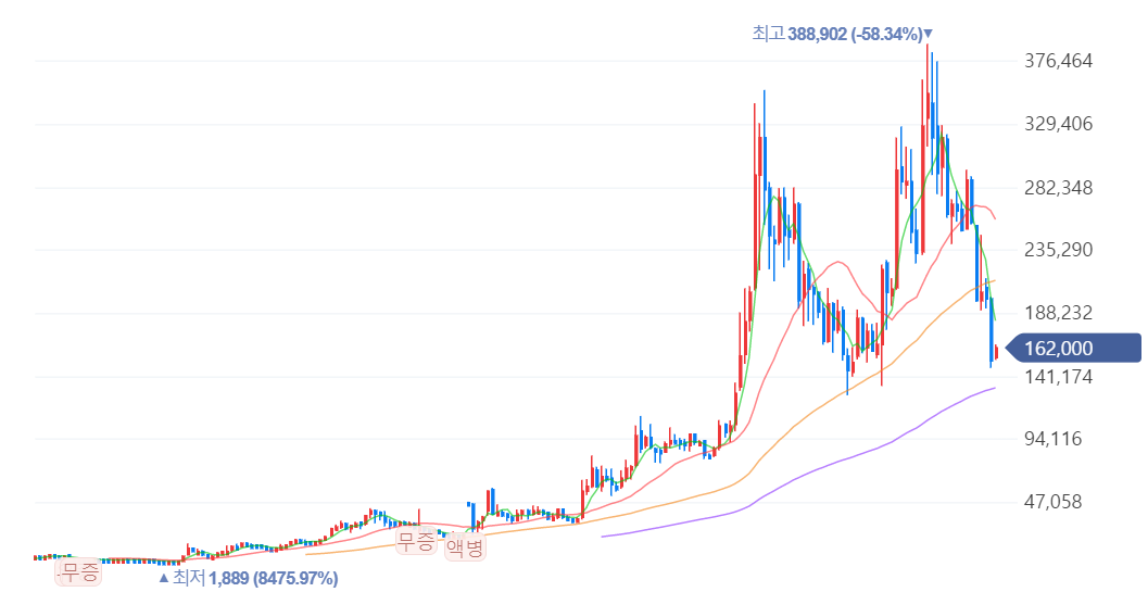 2021년 경에 38만원을 찍고 반토막난 주가가 보인다.